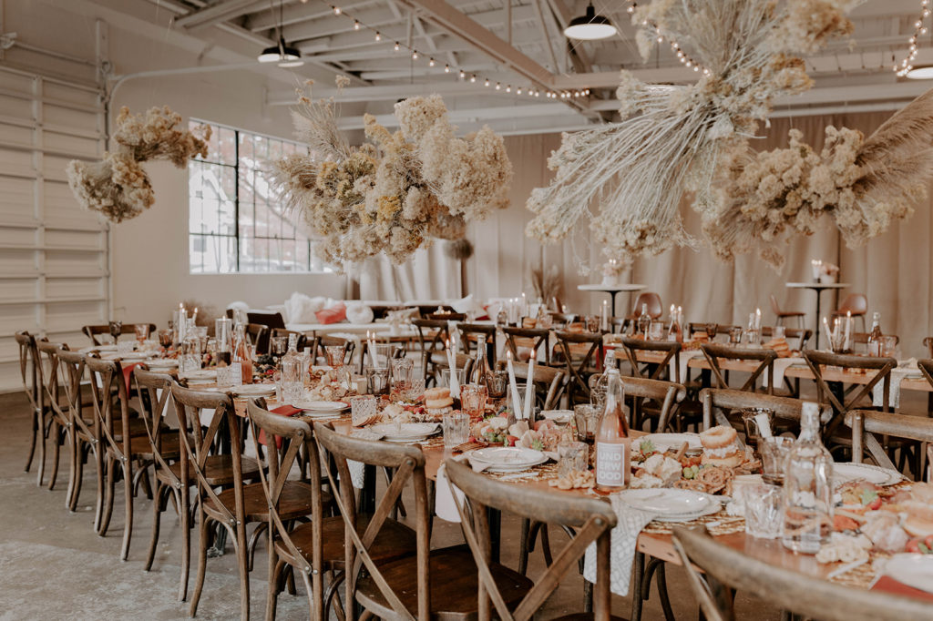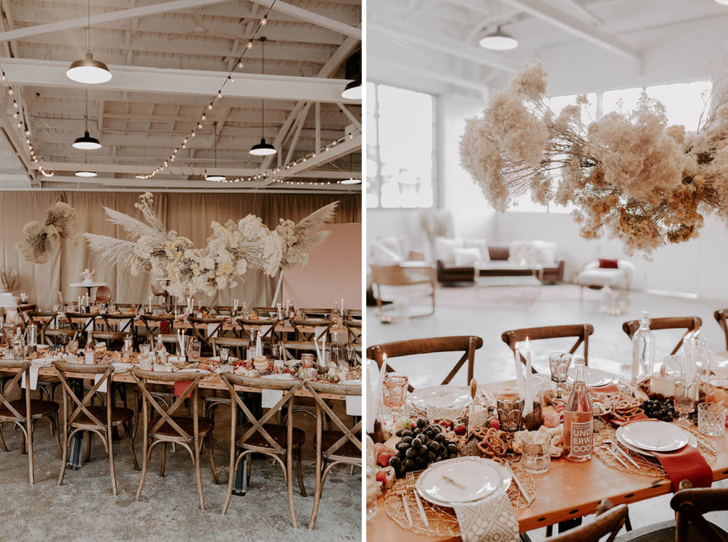 Neutrals + rose gold hues. Combining vintage + modern plates, vintage glassware and modern silverware help bring an eclectic vibe to the table, while the natural wood tables and cross back chairs let the settings take center stage.
